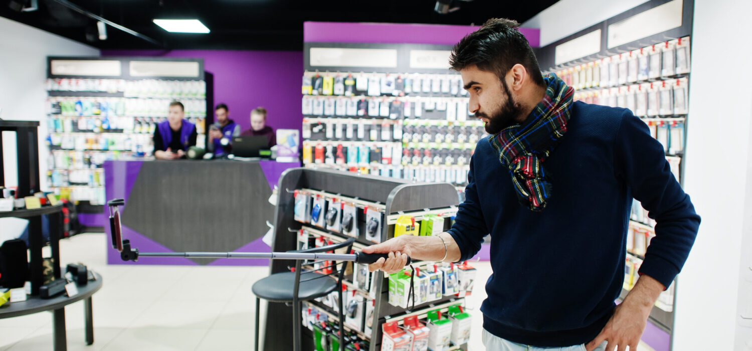 Indian man customer buyer at mobile phone store making selfie by smartphone on monopod stick. South asian peoples and technologies concept. Cellphone shop.