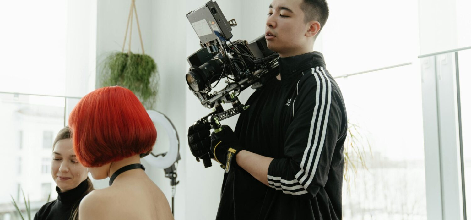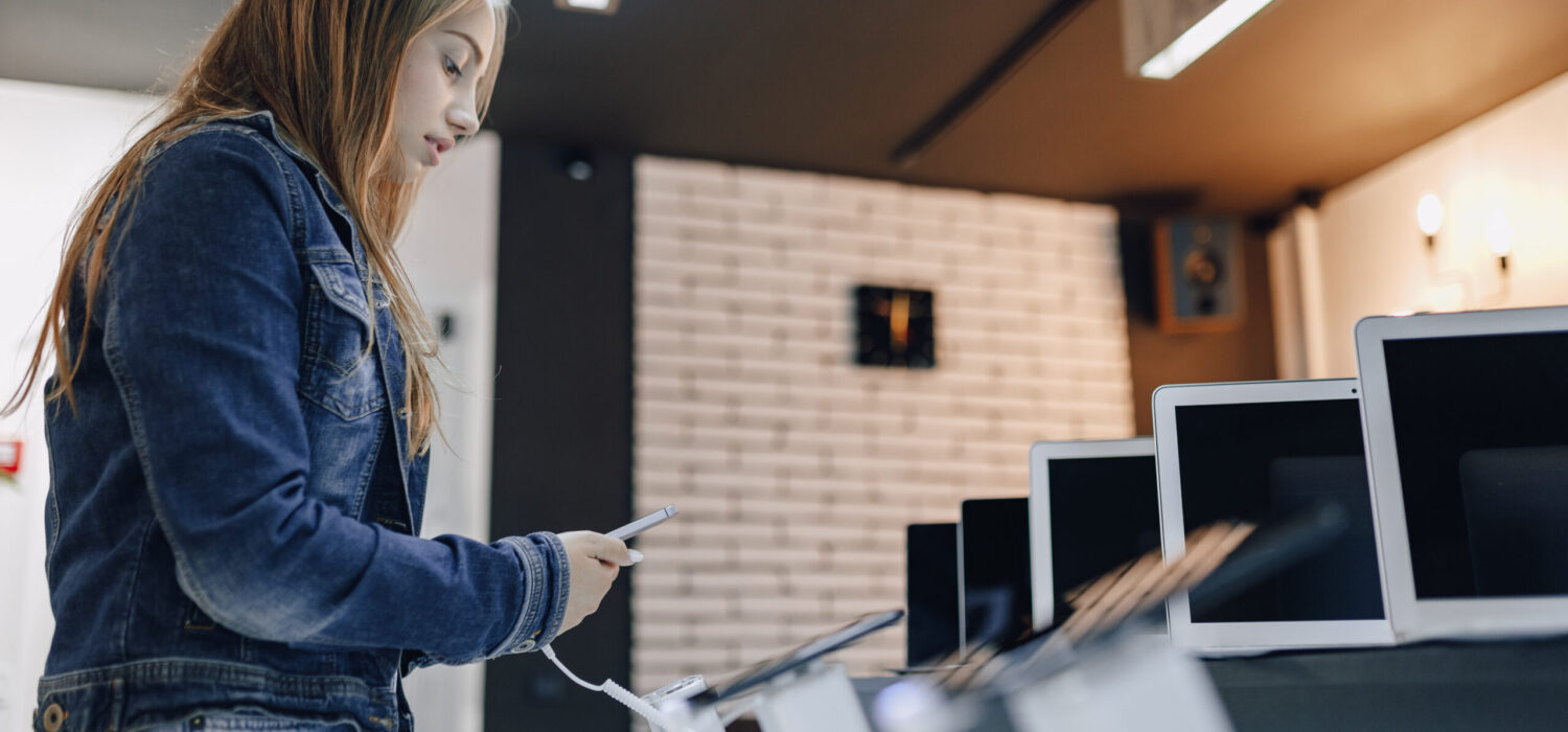 young attractive girl in electronics store stands at desk and tests phone. phones shop. concept of buying gadgets.