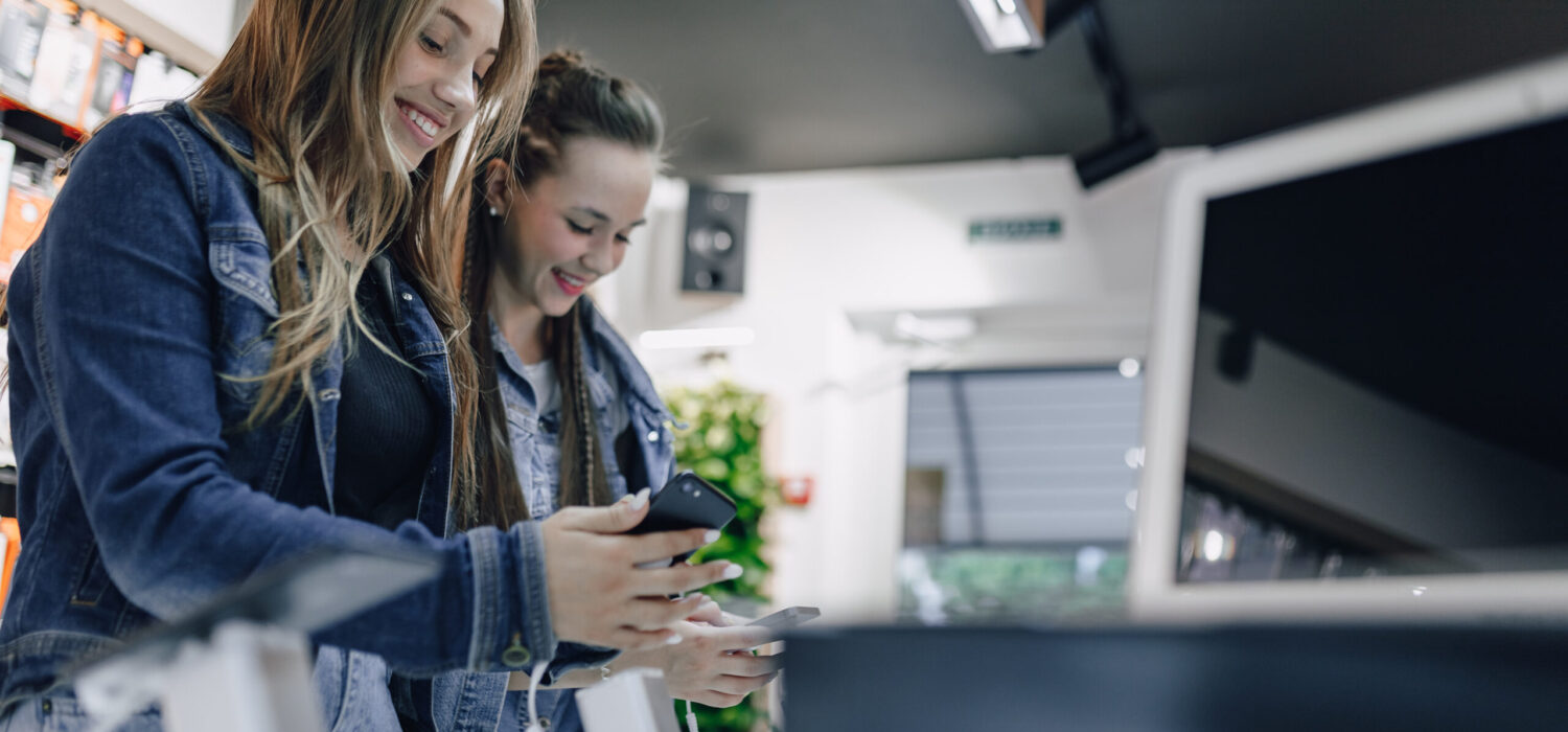 young attractive girls in electronics shop testing phones on a shop window. phone store. concept of buying gadgets.